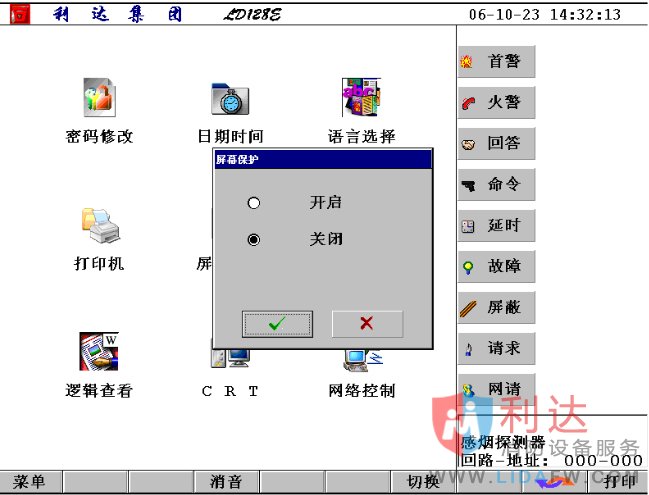控制器可設置屏幕保護功能。設置后,在正常情況下,顯示屏熄滅。如發生火警、故障等任何事件或按動按鍵,顯示屏自動亮;如有報警,則顯示屏長亮。 畫面下方顯示當前設置狀態。 點擊開啟或關閉并確認可控制液晶保護功能。